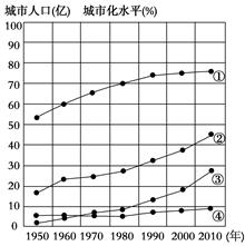 小题1:发达国家城市化水平现在已达70%以上,应对应曲线①;发展中国家城市化水平已达40%以上,且发展快,应对应曲线②;发展中国家城市人口已超过发达国家城市人口,所以发展中国家城市人口对应曲线③;发达国家城市人口对应曲线④。故选D。