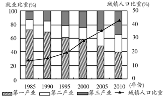 1、单选题 下图表示安徽省1985-2010年就业结构与城镇人口比重变化。完成(1)~(3)题。