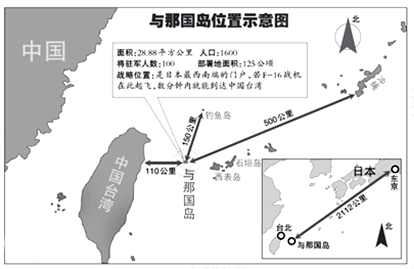 1、单选题 据台湾《联合报》报道,日本《东京新闻》2013年8月2日报道称日本计划派遣日本陆上自卫队进驻最西南侧的与那国岛,日本防卫省随后证实了此报道。报道称(如图所示),与那国岛距台湾地区的花莲县只有110公里,距钓鱼岛150公里,距日本现在驻军的冲绳却有500公里,是日本最西南侧的门户,居民只有1600人,日本过去并未在此驻军。据此回答下列各题。