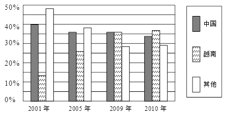 (4)材料二表明,2001至2010年越南生产的耐克鞋类所占比重逐渐________,近年来该类产业向东南亚一些国家转移,这些国家主要优势是________。(4分)?
