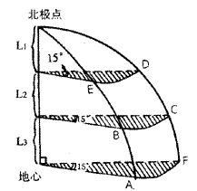 小题2:二分日,图中A、C、D、E、F各点中,与B点昼长相同且地方时不相同的有几个(?)