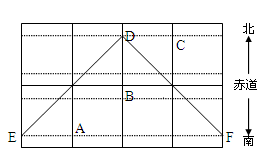 2、综合题 下图为某日太阳光照示意图,图中EDF表示晨昏线,且ED为晨线。