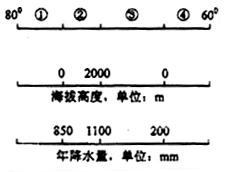 1、单选题 下图为45°S附近某地区的三组相关数据,其中①④处为海洋,②—③处为陆地,8O°、6O°为当地经度,回答下列各题。