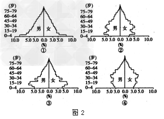2.图2是新中国成立以来四个不同时期的人口年龄结构金字塔图,按时间先后排序正确的是