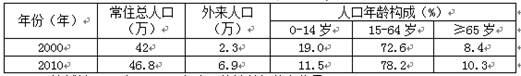 小题1:根据表格数据分析,该地0-14岁人口占比重明显下降,说明人口出生率下降,导致常住人口总数上升的主要原因是外来人口增长,A错。 老年人口比重上升,社会养老负担加重,B错。人口出生率下降,15-64岁人口比例上升是受外来人口增加的影响 ,C对。出生率下降,家庭抚养少儿的负担减轻,D错。