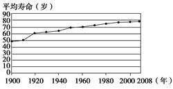 材料2:美国人均寿命变化示意图(1900~2008年)。