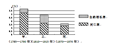 本题解析:试题分析:人口出生率-死亡率=人口自然增长率;可计算其人口出生率的变化,D项正确;直接根据三个阶段的人口三率特征可判断,甲阶段其人口增长模式属于高高低模式;乙阶段处于高低高解题,丙阶段属于低低低模式。