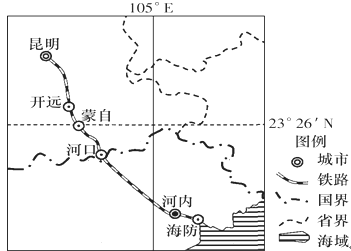 “滇越铁路”是云南省的第一条铁路,由法国政府在1910年修建,全长854千米,因轨距为一米,被称为“米轨铁路”,沿途保留了中国最早的邮电局、海关等众多旧址。目前, “滇越铁路”旅游资源的开发已提上议事日程。下图为滇越铁路示意图。