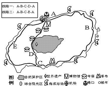 (1)某国际旅游团到该岛进行一日游,在线路一和线路二中选择了线路一。运用旅游地理知识,分折线路一的优势。