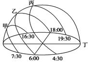 5、单选题 2013年6月21日7时09分,太阳直射北回归线。读图回答:甲、乙、丙、丁四条曲线中表示该日北京太阳视运动路线的是? ( )。