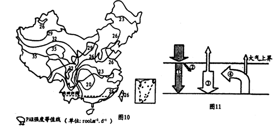 4、单选题 能被植物光合作用利用的太阳辐射,称为光合有效辐射(PAR)。图10为1961~2007年我国年平均PAR强度的空间分布图;图11为大气受热过程示意图。读图回答5~6题。