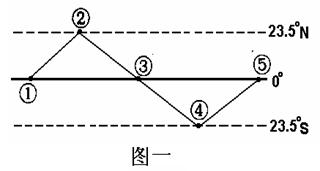 2、单选题 2007年10月24日18:05(北京时间),中国自己设计的“嫦娥一号”月球探测卫星发射升空,开始了太空旅行。阅读该图:太阳直射点周年变化示意图,回答问题。