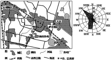 材料二:大庆市城区分布图和大庆多年平均风向玫瑰图