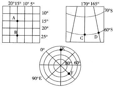 (3)图中F点的地理坐标是?,所属的半球是?,所属的纬度地带?,F点在E点的?方向