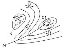 1、单选题 读北半球某地等压线分布图,图中A、B、C、D四处风向正确的是( )