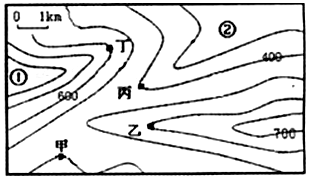 小题1:在等值线图上,数值变化总是符合递增或递减的顺序,根据左侧或右侧递变顺序,甲处可能是400米,也可能县局相邻等值线数值相同,为500米,A对。根据等值线凸出情况,乙处是山脊,不可能有河流,B错。丙处是山谷;西面或东南面有山脊阻挡视线,不能通视全区,C错。丁处是山脊,等高线密集,面积狭小,不适宜建民居,D错。