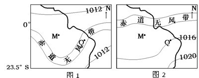 2、单选题 图1与图2反映了本区不同季节的气压分布情况(单位:百帕),图中M城(海拔44米)和Q?城(海拔199米)的年平均气温和年降水量分别是:26.6℃、2100 mm和27.2℃、765 mm。完成下列各题。