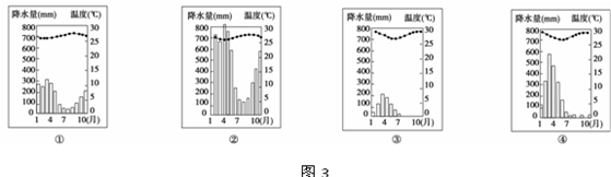 1.图3中最能反映M城与Q城气候特征的一组图是