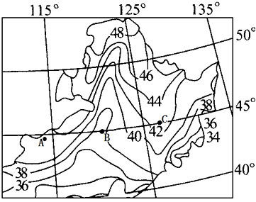 (2)比较ABC三地年较差的大小,并简述其原因。(8分)