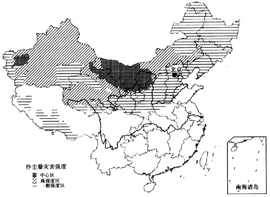 (1)由材料二分析,我国沙尘暴的中心区,除了新疆,还有____________、_____________等地区。