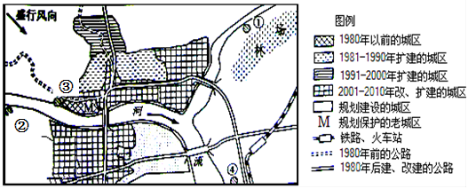 1、单选题 下图为“1980年以来某城市空间变化示意图”。读图完成题。