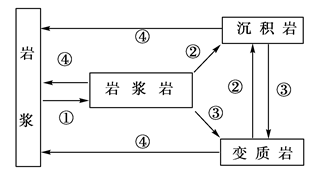 点评:本题难度低,学生只要认真读图,抓住三大类岩石和岩浆之间相互转化的地质作用即可分析。