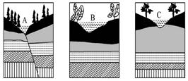 2、单选题 A、B、C分别表示一条河流不同河段上的三个点,读三处的横截面剖面图回答问题。