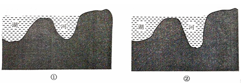 2、单选题 河流中下游地区的湖泊对河流径流有调节作用,河流或湖泊上游地区修建水库,对湖泊的水位有着重要的影响。下图①、②分别为水库修建前后湖泊的横截面示意图,读图回答下列问题。