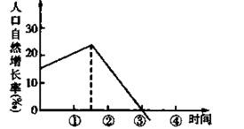 小题2:只要人口自然增长率大于0,人口总数就持续增长。读图,该国在①、②阶段人口自然增长率都大于0,人口不断增长,未达到最大值,A、B错。到③时期人口自然增长率等于0,所以此时人口达到最大值。C对。在④时期,人口自然增长率小于0,人口总量比③时期减少,不是最大值,D错。