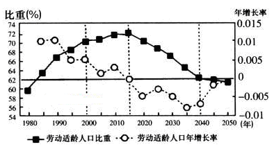 小题1:图中信息表明劳动适龄人口比重年增长率为正值时,劳动适龄人口比重上升,劳动适龄人口比重年增长率为负值时,劳动适龄人口比重下降;2015年劳动适龄人口比重年增长率为零,劳动适龄人口所占比重最大;1980年年劳动适龄人口比重达到最低值,但劳动力的数量并不一定少,不一定会出现不足;而2010年以前劳动适龄人口比重持续上升,年增长率呈下降趋势。故选B。