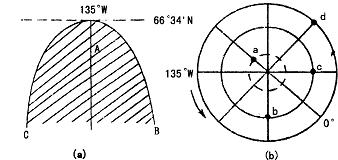 (1)图(a)中CAB为晨昏线的一段,请将其转绘到图(b)中,并用阴影表示夜半球。(2分)