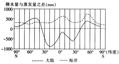 3、单选题 读地球上大陆和海洋各纬度带的水平衡(降水量减去蒸发量)图,结合所学知识,回答1~2题。