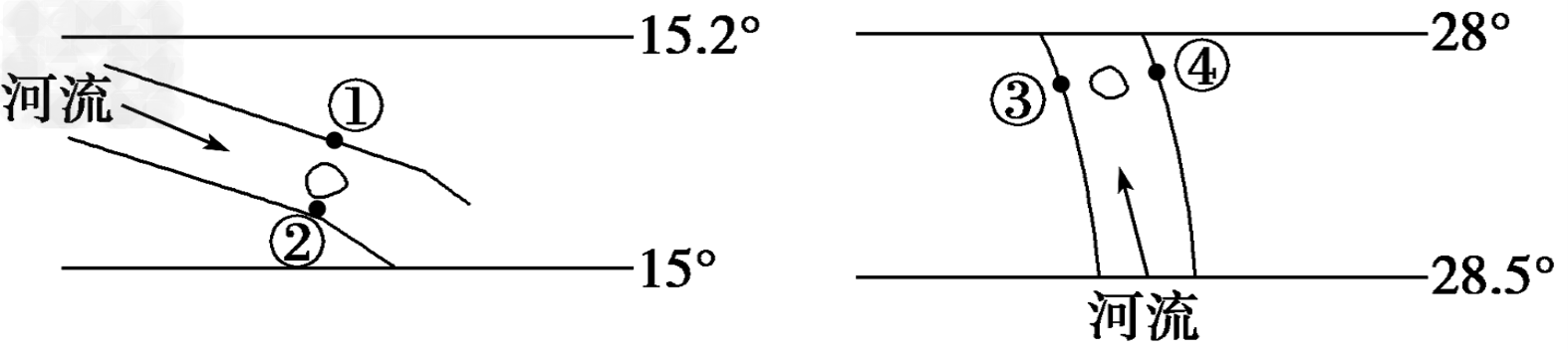 4、单选题 下图所示,两条河流下游各有一个小岛,最终小岛可能连接的堤岸是