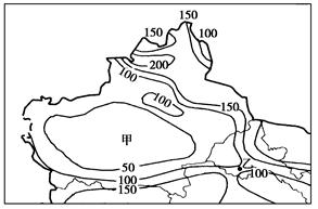 【小题1】乙地处于数值为100和150的等值线包围之中,其数值范围为100~150,但因乙地距离数值为100的等值线较近,其最有可能的数值是110。