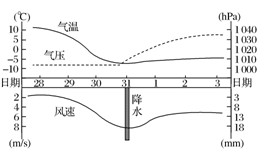 2、单选题 近期衡水经历了一次降雪过程,读“某天气系统经过衡水市前后的气温、气压、降水、风速变化示意图”,完成下面3题。