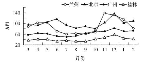 3、综合题 【环境保护】(10分)材料一:下图四城市是我国各地区城市污染的典型代表,图中反映近几年来四地API(空气污染指数)随季节的变化图。