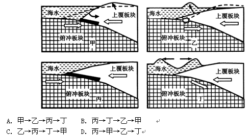 小题2:海啸的形成原理可概括为:“俯冲板块向上覆板块下方俯冲运动,上覆板块缓慢变形,不断积累弹性能量,最终达到极限,上覆板块弹起,形成巨大水柱,向两侧传播,形成海啸。”下图中能正确表示海啸形成顺序的是