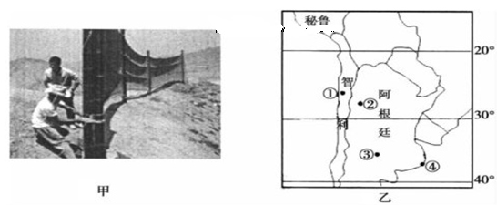 4、单选题 下图中甲中为一张长12米、宽4米的大网,网的下方有水槽可以把网上流下的水引向一个蓄水池。图乙为南美洲部分国家图,读图回答下列问题。