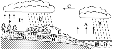 小题1:水循环的主要环节有:蒸发、降水、水汽输送、地表径流、下渗、地下径流、植物蒸腾等。图中C为水汽输送,E为地表径流,ACDEHG实现了海陆间水循环。所以本题选择B选项。