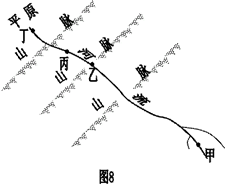 小题2:图8 所示甲、乙、丙、丁四地中,适宜修建水坝的是
