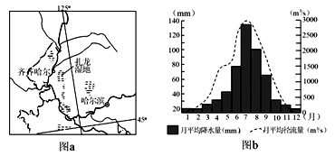 2、单选题 a为扎龙国家级自然保护区位置图,图b为齐齐哈尔降水量及流经该地河流径流量示意图。读图完成下列小题。
