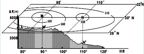 5、单选题  图中阴影部分为沿30oN的部分区域垂直剖面图,平行四边形内为与该区域对应的6000米高空水平面某时等压线(单位:hpa)分布状况。读图回答题。