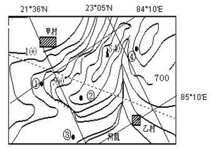 1.图中河流的流向为2.图中陡崖的顶部高度可能是3.既能看到甲村又能看到乙村的地点是4.假如自然地理环境不变,下面四地附近最有可能发掘出早期原始人住居遗址的是