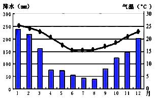 (2)该地为热带草原气候(3分);6-7月气温较低(3分),降水少,晴天较多(3分)
