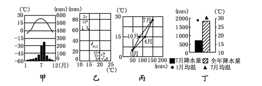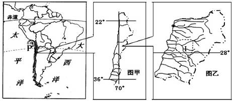 (1)根据图乙中Ⅰ区域位置可判定,该区域为智利,热带沙漠气候位置,该国全年降水少,西部为安第斯山脉,海拔高,所以河流补给类型以高山冰雪融水补给为主;因西部为山地,地势起伏大,河流短小,因沙漠气候影响,降水少,蒸发量大,河流流量小。