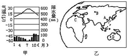 1.甲是某地气温和降水量月份分配图,在乙图中属于此气候类型的地点是(?)