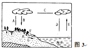 (2)写出图中各字母代表的水循环环节的名称:C_________;F_________。人类修建水库工程影响的是_______环节(可填字母)。