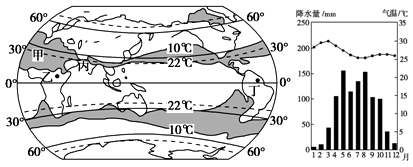 5、单选题 图a为世界1月平均气温10 ℃~22 ℃范围示意图,图b为某地年内各月气温变化曲线与降水量柱状图。读图回答下列各题。