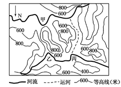 【小题1】甲处等高线闭合,且中间高四周低,为山峰;图中海拔最高处为300到350米之间,最低处为0到50米之间,相对高差介于250到350米之间;丙地等高线稀疏,地形平坦,靠近河流,水源充足,利于聚落的形成;河流处海拔较低,等高线凸向高值方向,因此图中河流自丙流向乙地。