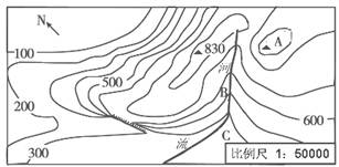 D.B地可见V型峡谷,C地可见三角洲